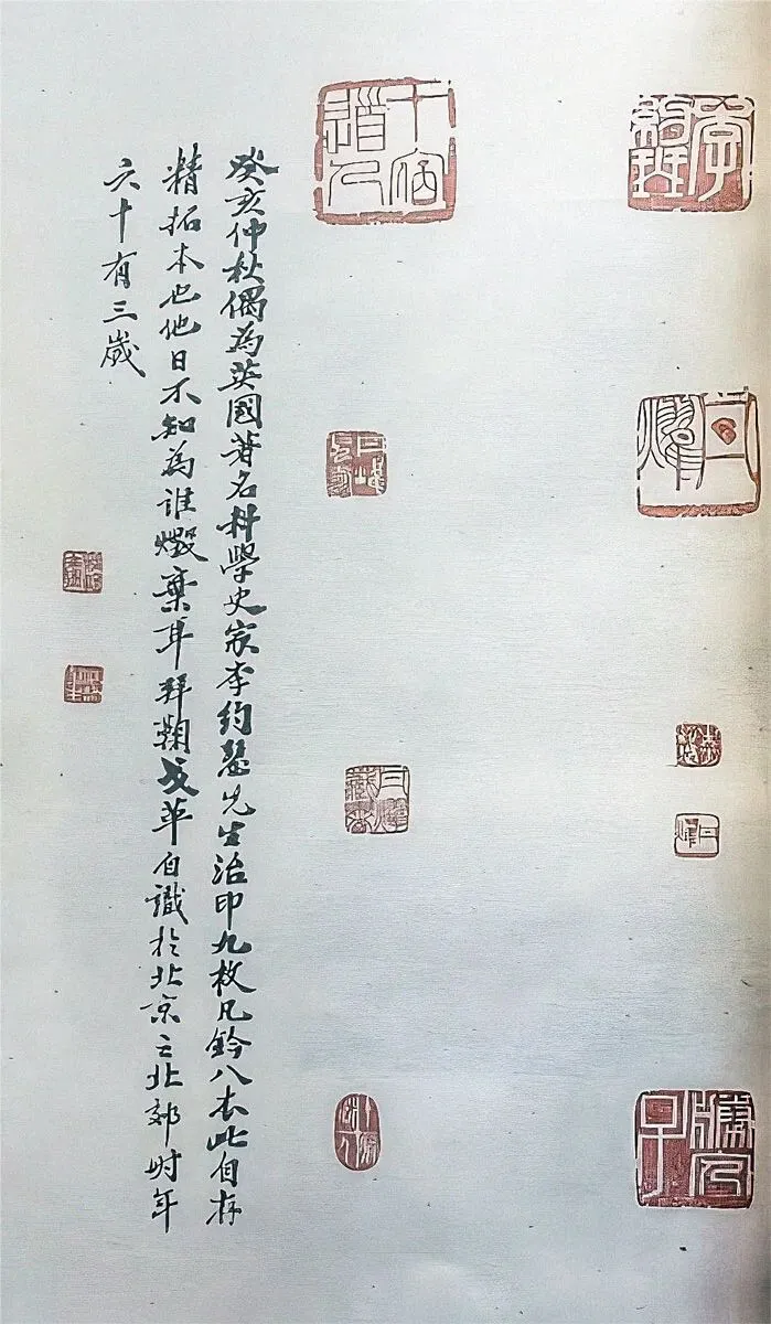 戈革觉得李约瑟作为一个外国人能心甘情愿地为中国科技史奉献大半生已实属不易,而更难能可贵的是,他为自己所取的汉文姓名、别号等所表现出的传统文化素养之深,令中国当代的科技史学者都难以企及。感动之际,便为李约瑟创作了这组9枚,包括姓名印、别号印、藏书印的组章,涉及李约瑟使用过的所有姓名、别号[3]。