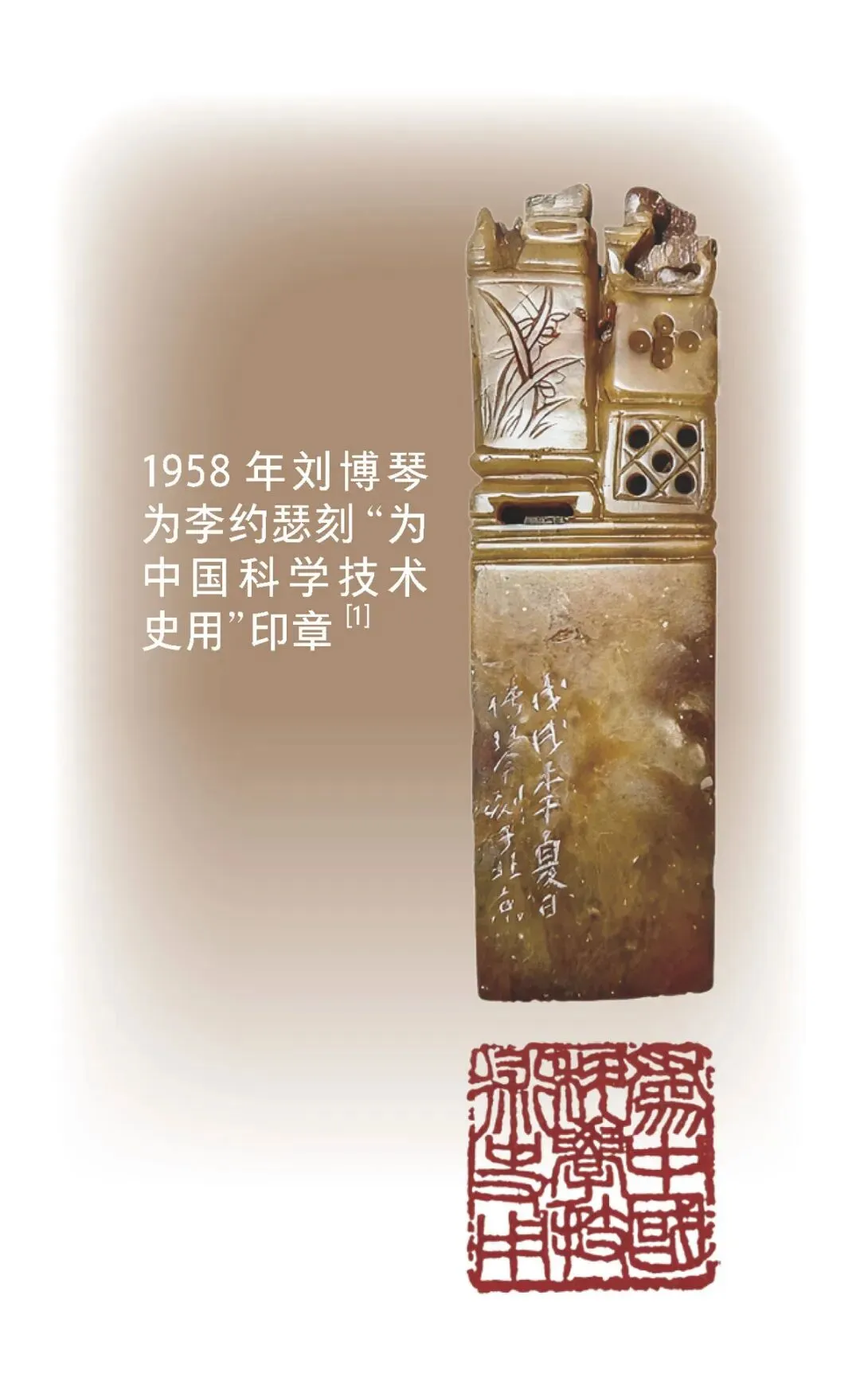 在中国科技史家送给李约瑟的礼物中,书法和篆刻占有相当的比重。以中国文字为载体的传统艺术表现形式,可以说自李约瑟接触汉字之初便一直吸引着他。在遍访中国高校及科研机构的日子里,李约瑟与诸多的自然科学家、社会科学家、科技史家过从甚密,甲骨四堂中的郭沫若和董作宾都有书法作品相赠,时任中央研究院历史语言研究所所长的傅斯年用朱砂书写的《道德经》截句大获李约瑟“道心”,农史学家石声汉则以“人道敏政 地道敏树”的书法立轴作为定交之礼。而篆刻的审美意趣和实用价值所表现出的艺术魅力同样深得李约瑟的欢心。这使他在初走古丝绸之路时,便开始或买或捡地收集沙漠中能做印章的五彩石头,或留作自用,或惠赠友人,竟忘了卡车抛锚的烦恼。李约瑟研究所成立后,他直接选用“为中国科学技术史用”的印文作为所徽,并应用在研究所的奠基石、信笺纸,以及东亚科学史图书馆的招牌上。
