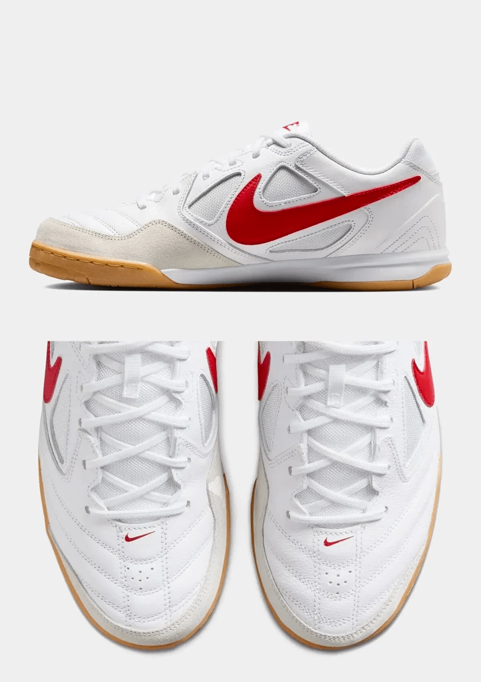 这套造型以Nike经典室内足球鞋Gato为原型来设计,鞋身的Swoosh标志、鞋带及网眼材质经过解构,被完整融入短版上衣和热裤,像是“把球鞋穿在了身上”。
