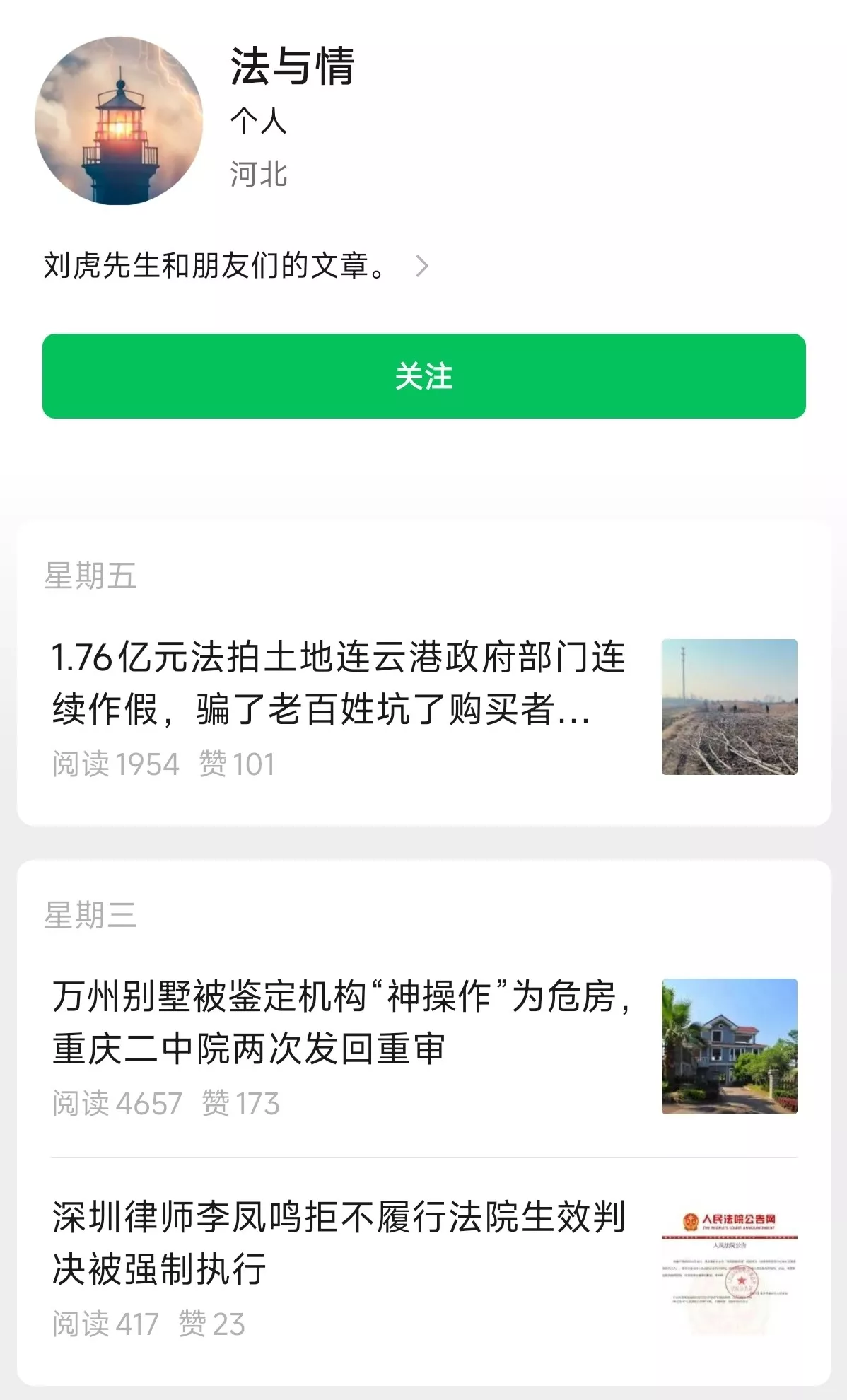 刘虎目前是一名自媒体人,日常通过“法与情”微信公众号发布社会事件相关的调查内容。(微信公众号@法与情)