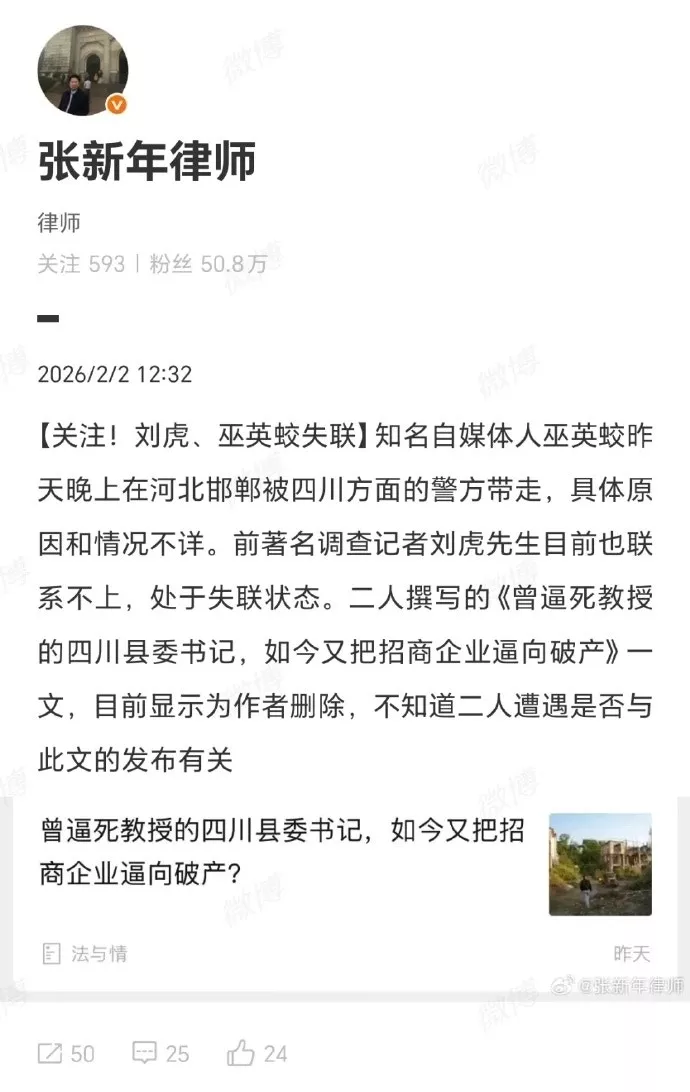 中国前知名调查记者刘虎、知名自媒体人巫英蛟被四川警方带走,引发舆论关注。而在被警方带走前,刘虎、巫英蛟曾在网络平台发布文章《曾逼死教授的四川县委书记,如今又把招商企业逼向破产》。警方指二人涉嫌诬告陷害罪和非法经营罪被立案侦查,目前二人获保释。