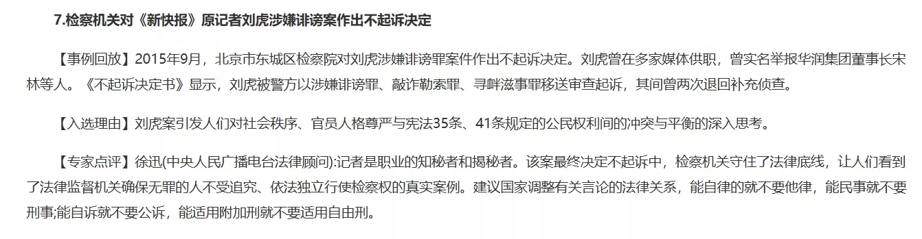 直到2014年8月3日,被羁押346天的刘虎才被取保候审。2015年9月10日,北京市东城区检察院因“事实不清、证据不足”,决定不起诉。刘虎案曾在当年入选“2015年中国十大传媒法事例”,官方指刘虎案引发人们对社会秩序、官员人格尊严与公民的言论自由和批评监督权等权利的冲突与平衡的深入思考。