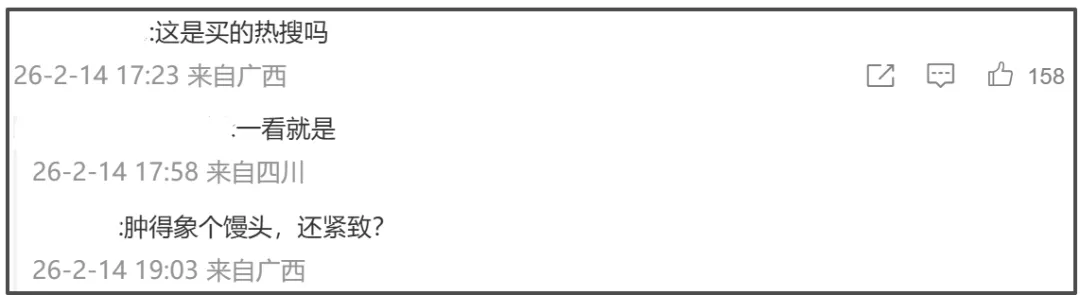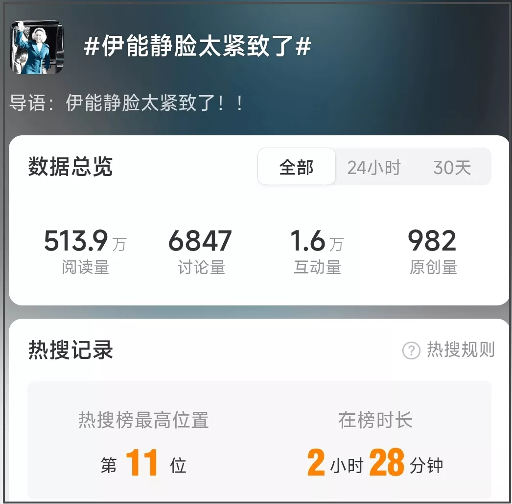 有趣的是,伊能静彩排路透曝光之后,“伊能静脸太紧致了”的话题登上了热搜。热搜广场前排都是营销号统一话术的博文,可是,某些博主的发文控制得了,网友的留言却控不住,评论区直接沦陷。