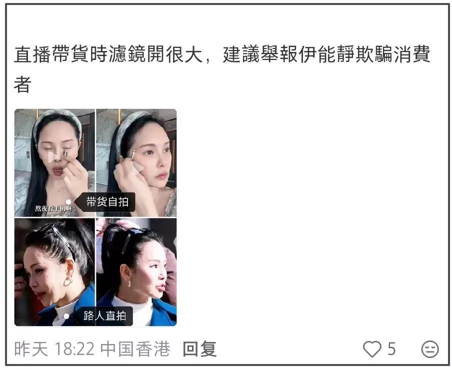 在直播间的美颜滤镜加持之下,伊能静的脸确实看起来紧致细嫩有光泽。现在脱离了直播间的美颜滤镜,伊能静在自然光线下暴露出了最真实的面部状态,网友认为她的直播带货成了笑话,所谓的自用效果更是成为了虚假宣传,欺骗消费者,不敢再相信她卖的东西了。