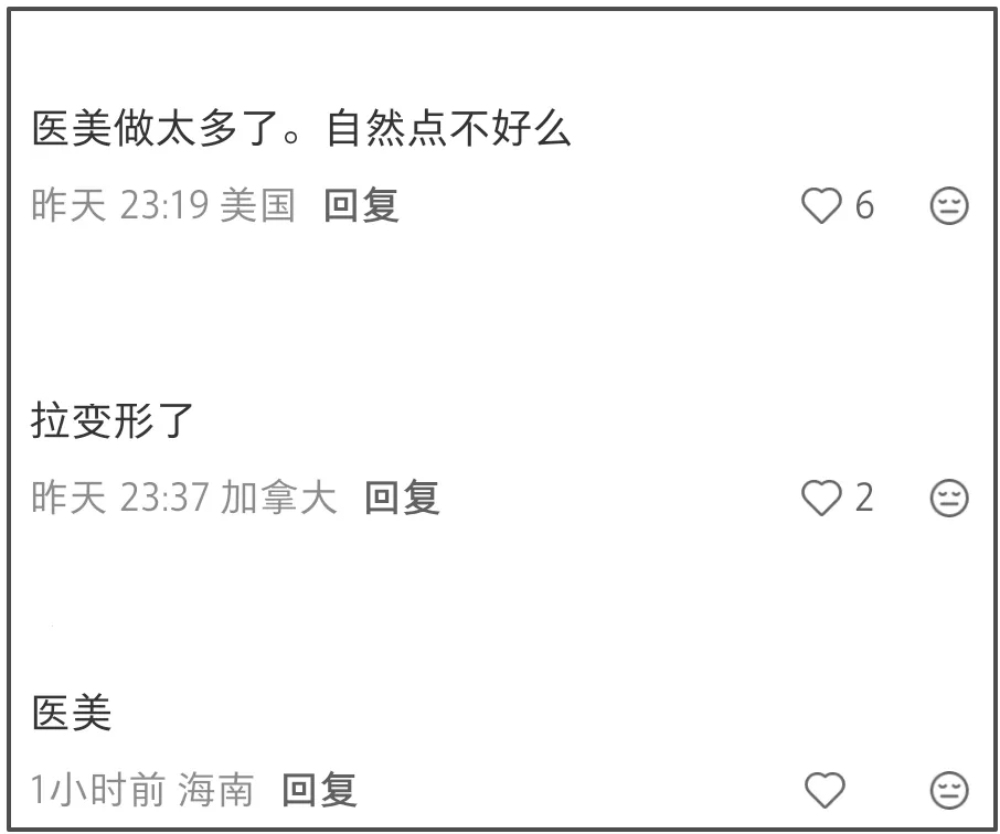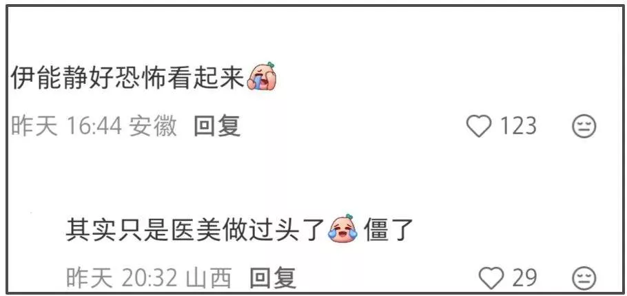 不管是面无表情也好,还是笑起来也好,伊能静的脸都充满了僵硬感,做表情也像是假笑,给人一种皮笑肉不笑的感觉。如果说之前的伊能静给人的印象是温柔优雅,那么这一次脸僵、医美痕迹明显的她给人的印象则变成了恐怖。大家纷纷留言吐槽她医美做得太多,脸都已经变形了。
