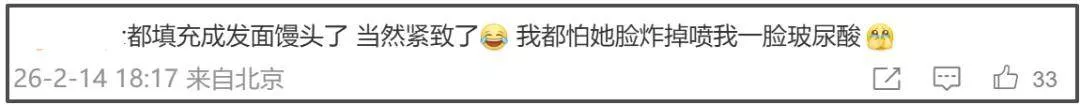 网友们纷纷在前排博主文章的评论区吐槽伊能静的状态,表示一看就是医美脸,不知道有什么值得宣扬的。此外,还有网友讽刺称“都填充成发面馒头了,当然紧致了”。