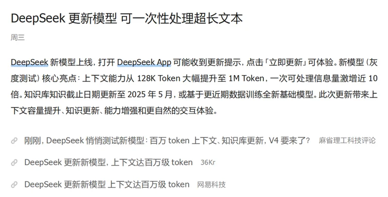 2月11日,MiniMax与DeepSeek几乎同时更新。前者切换至M2.5版本,优化工具调用与任务执行,后者则将上下文长度扩展至百万Token级别。