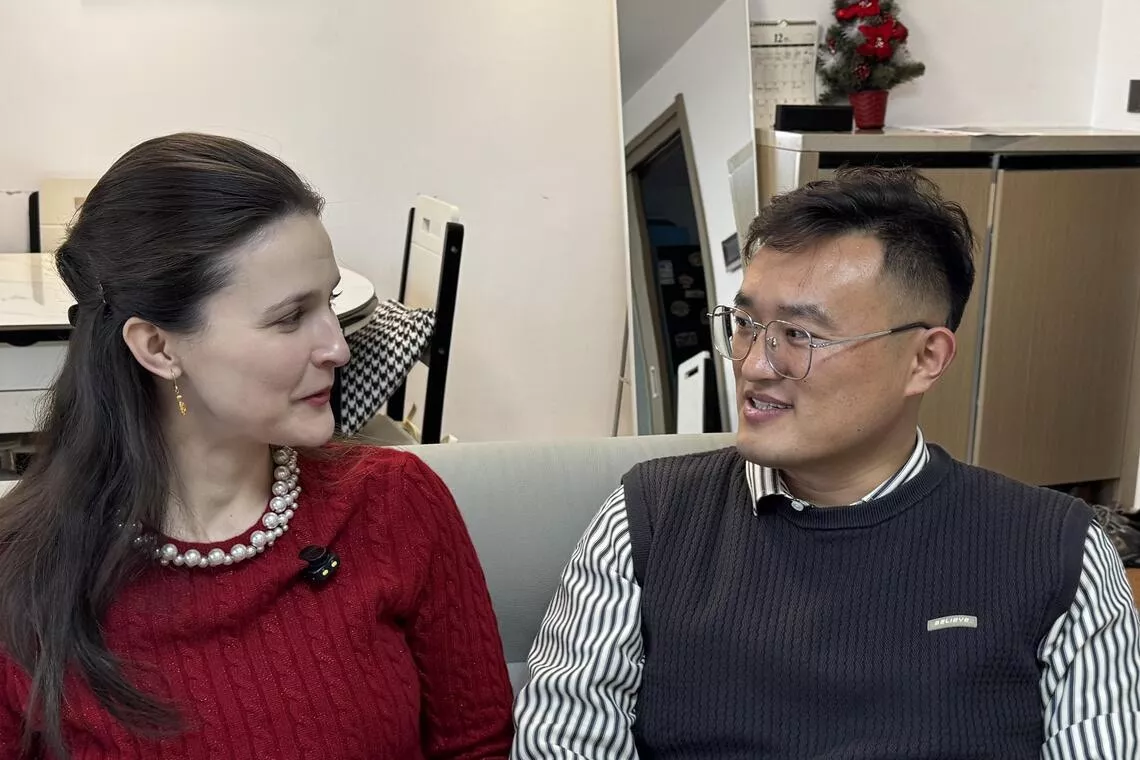 26岁俄罗斯女生小莲(左)能讲流利的普通话,不看长相,还以为是中国人在说话。她与34岁山东老公高士会(右)互补性强,“文科女”善表达、急躁,“理工男”话不多、沉稳。(《联合早报》)