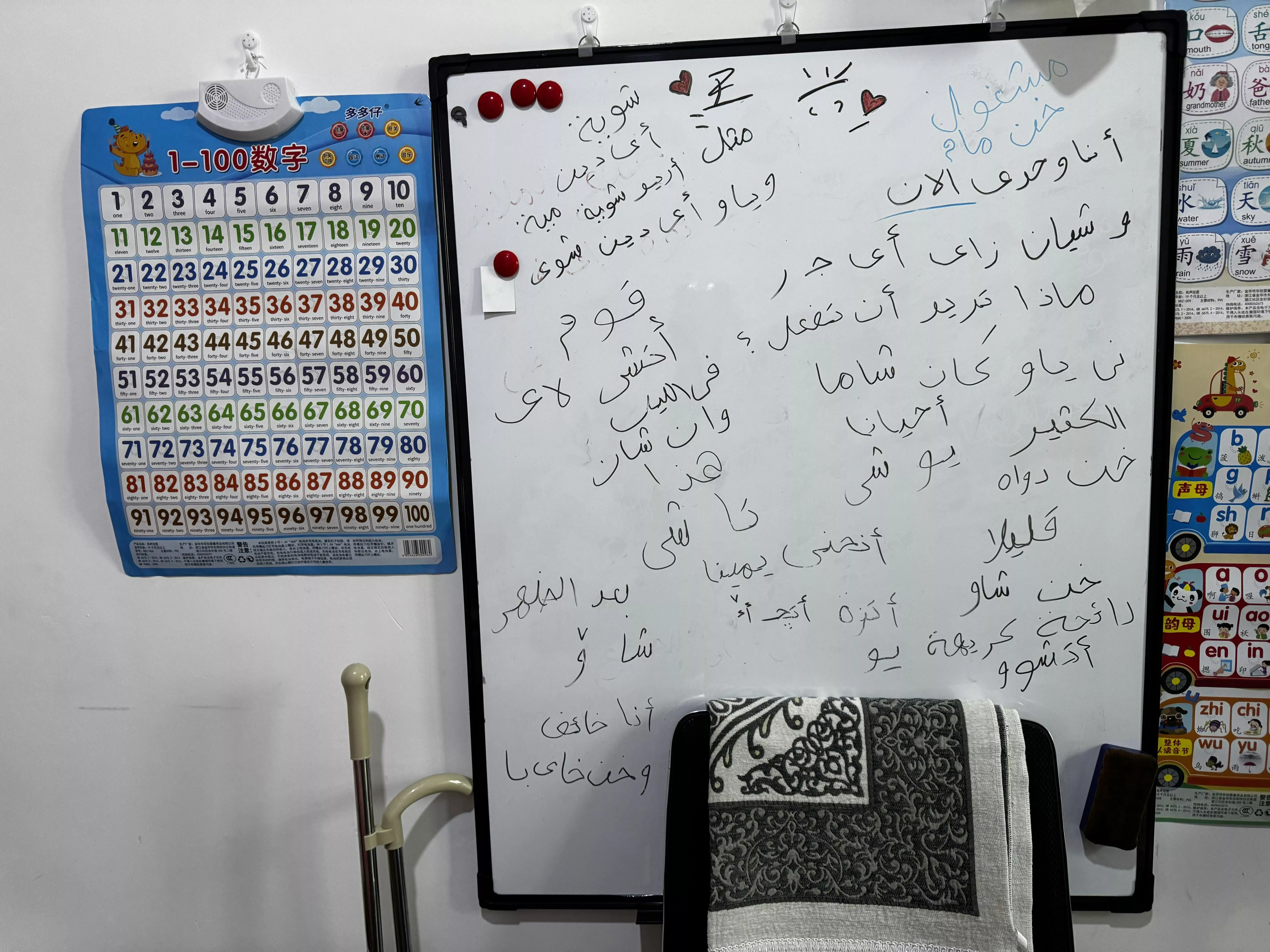 宿舍空间虽不大,但卫生间和小厨房都有,记者和王兴各坐一张椅子,美娜坐床上。墙上贴着别人看不懂的纸张,王兴笑说那是太太的密码本——用阿拉伯语标注汉语发音。