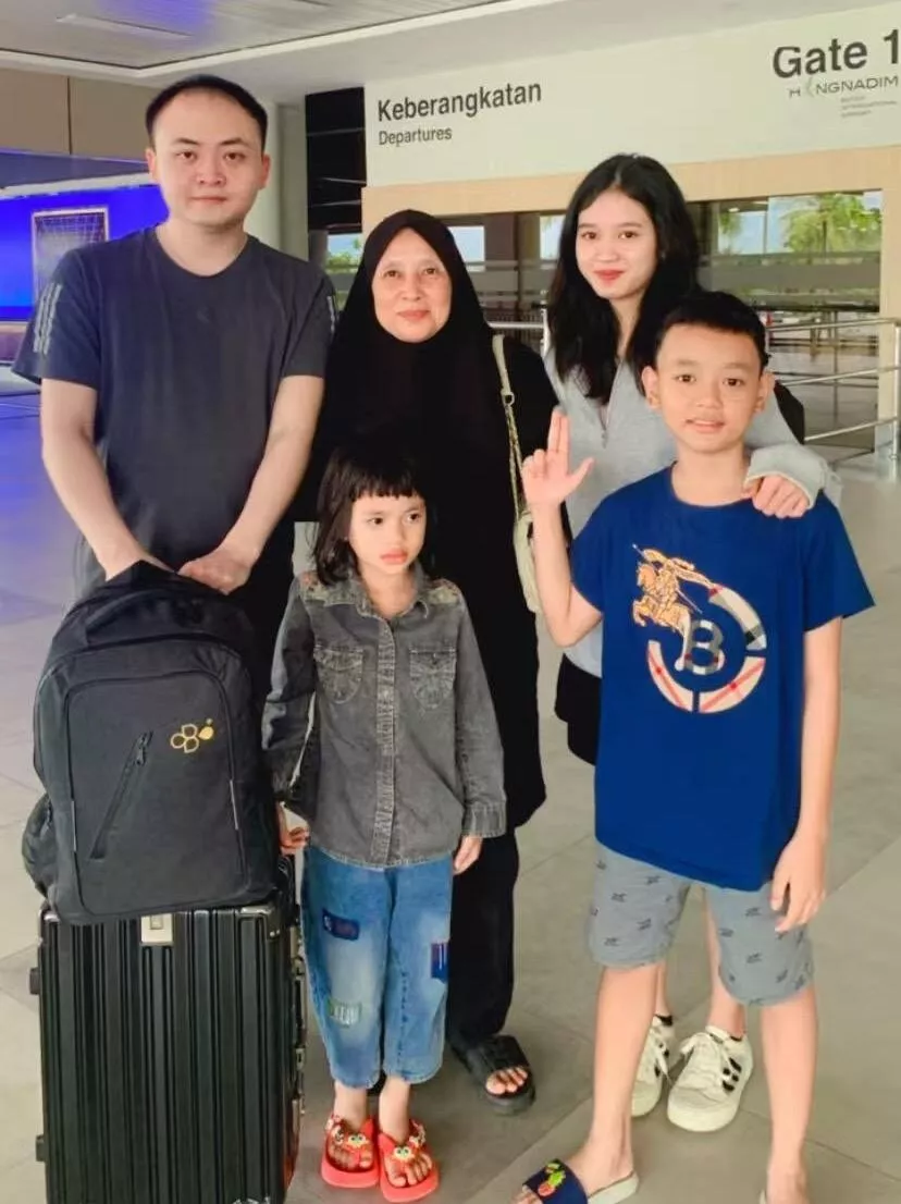 29岁福建小伙子卢圳良一年多前迎娶22岁印尼女生娜娜。图为卢圳良(后排左起)、娜娜的母亲、娜娜、娜娜的弟弟(前排右一)和妹妹(前排右二),摄于峇淡岛机场。(《联合早报》)