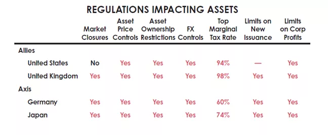 许多国家普遍关闭了股市,使股票投资者被困,无法动用他们的资本。我还应该指出,在战争期间,货币和信贷在非盟国之间通常不被普遍接受,因为人们有理由担心货币是否还有价值。如前所述,黄金——或者在某些情况下,白银或实物交易——是战争时期的硬通货。在这种时候,价格和资本流动通常受到控制,所以很难说许多东西的真实价格是多少。