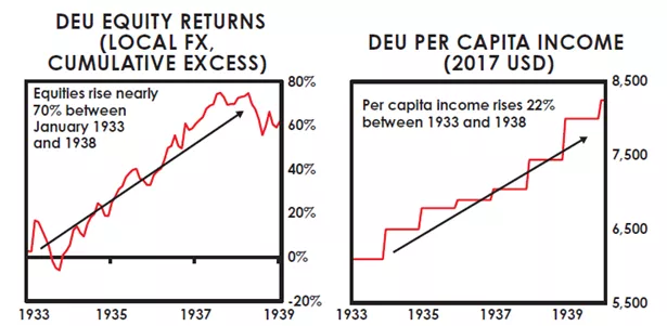 至于这些政策的经济效果,当希特勒在1933年上台时,失业率为25%。到1938年,失业率为零。希特勒掌权后的五年里,人均收入增长了22%,1934年至1938年间,实际增长率平均超过8%。如下图所示,1933年至1938年间,德国股市稳步上涨了近70%,直到热战开始。