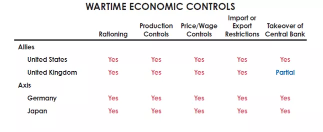 当美国在珍珠港事件后加入欧洲和太平洋战争时,大多数国家都实施了典型的战时经济政策,领导人们更威权的手段得到了民众的广泛支持。
