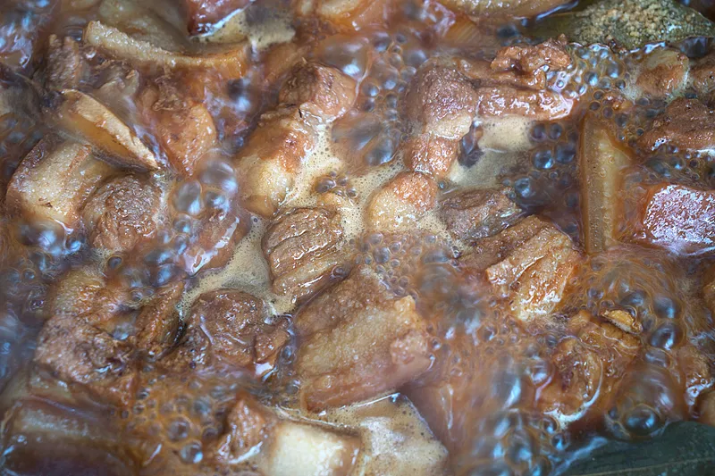 那么肉为什么煮着煮着就会产生泡沫?正是因为这些蛋白质溶解在热水中,减少了液体本身的表面张力,使其无法形成一个平整的表面而出现泡沫。随着不断炖煮、溶解,泡沫越来越多且变得能稳定存在。
