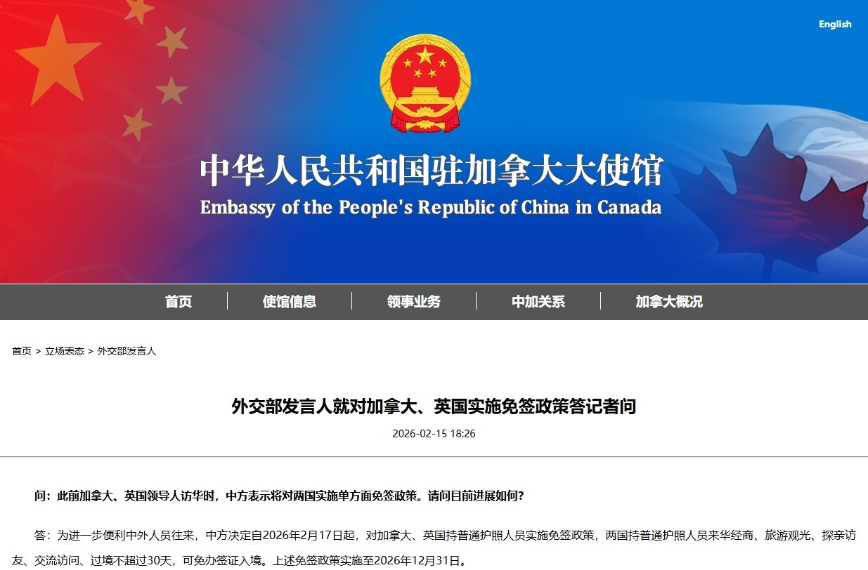 答:为进一步便利中外人员往来,中方决定自2026年2月17日起,对加拿大、英国持普通护照人员实施免签政策,两国持普通护照人员来华经商、旅游观光、探亲访友、交流访问、过境不超过30天,可免办签证入境。