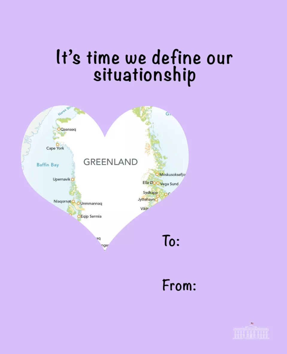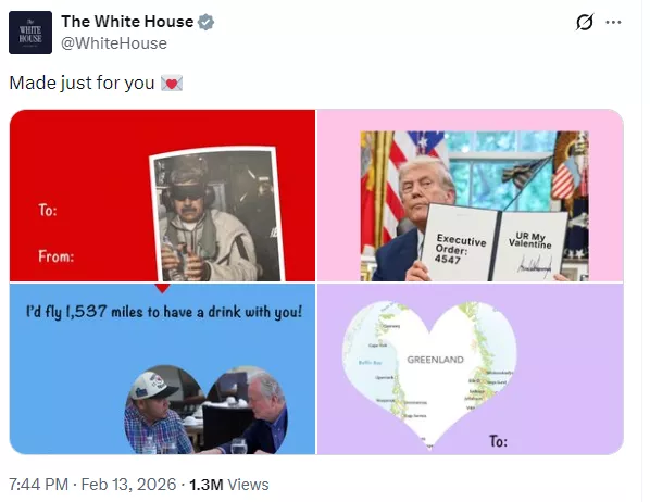 情人节当天,白宫官方账号突然丢出一组“情人节卡片”,主角却不是爱情,而是外交对手、移民争议、政府关门、甚至格陵兰岛。更让人意外的是,这些卡片用的,全是川普第二任期最出圈的“迷因画面”。