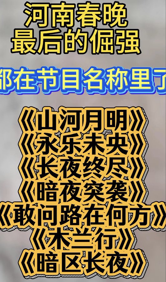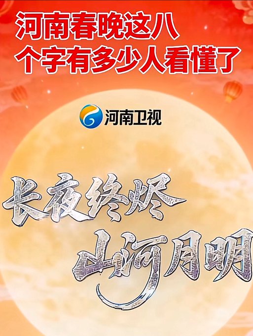河南卫视春节晚会被强制断播,原因不明。我今天用了两个小时回看了一些碎片化短视频大概知道原因了。它宣扬了中原传统文化,对“党的英明领导”没有一个字的宣传。被断播后,挂出了如下八个字:长夜终烬,山河月明。