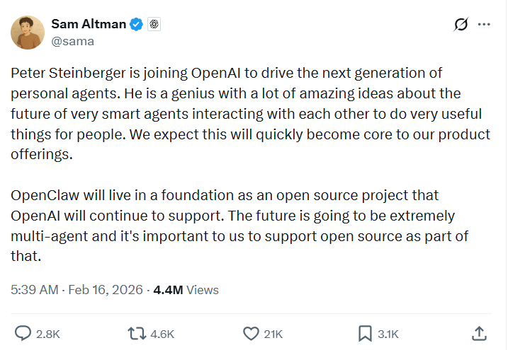 OpenAI CEO Sam Altman周日通过社交媒体X正式确认,开源智能体OpenClaw的创作者Peter Steinberger将加入公司。