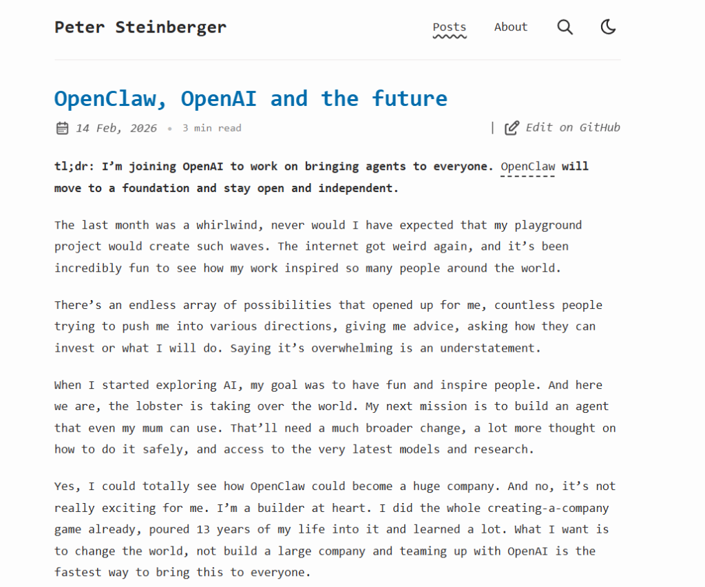Steinberger坦言:“最终,我觉得OpenAI是继续推动我的愿景并扩大其影响力的最佳场所。”