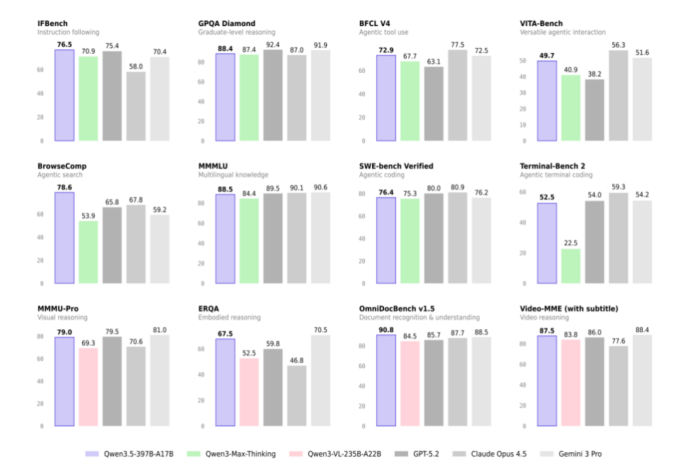 2月16日除夕当天,阿里巴巴开源全新一代大模型千问Qwen3.5-Plus,性能媲美Gemini 3 Pro,登顶全球最强开源模型。千问3.5实现了底层模型架构的全面革新,此次发布的Qwen3.5-Plus版本总参数为3970亿,激活仅170亿,以小胜大,性能超过万亿参数的Qwen3-Max模型,部署显存占用降低60%,推理效率大幅提升,最大推理吞吐量可提升至19倍。Qwen3.5-Plus的API价格每百万Token低至0.8元,仅为Gemini 3 pro的1/18。千问3.5在文本和视觉的混合数据上预训练,实现了原生多模态的新突破,在推理、编程、Agent智能体等全方位基准评估中均表现优异,并在视觉理解能力的权威评测中斩获数项性能最佳。
