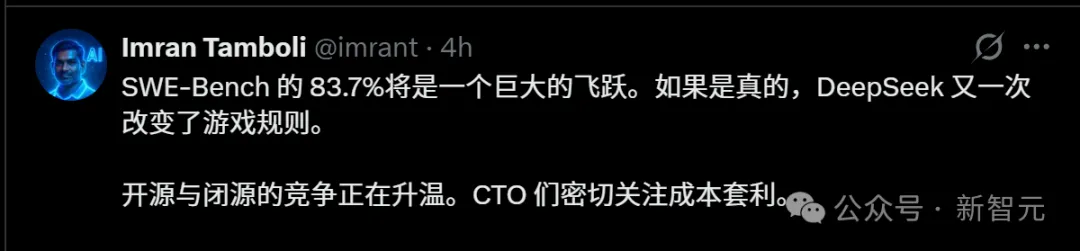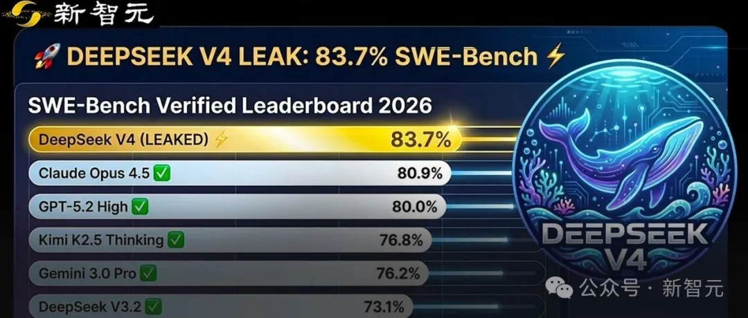 泄露信息显示,DeepSeek V4在SWE-bench Verified上取得了惊人的83.7%,超过了Claude Opus 4.5(80.9%)和GPT-5.2(80%)。