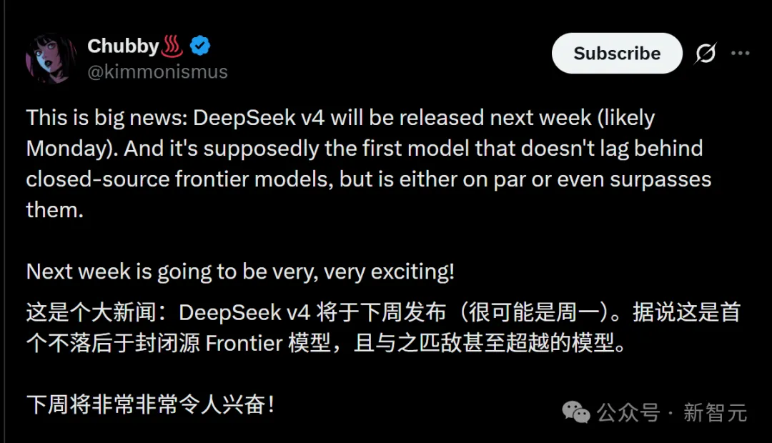 总之,DeepSeek V4的发布时间,很可能是周一。据说,这是首个不落后于闭源顶尖模型,甚至能与之匹敌甚至超越的模型。