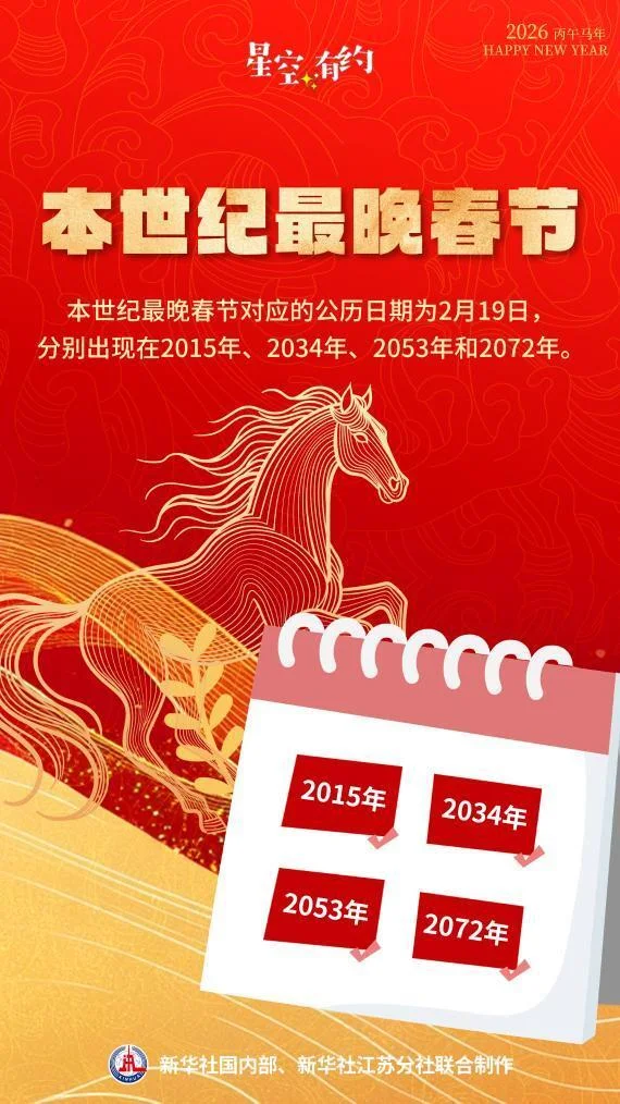 2月17日迎来丙午马年春节。翻开日历不难发现,相较于即将过去的乙巳蛇年(春节日期为1月29日),马年春节的公历日期推迟了近20天。这个春节为啥姗姗来迟?