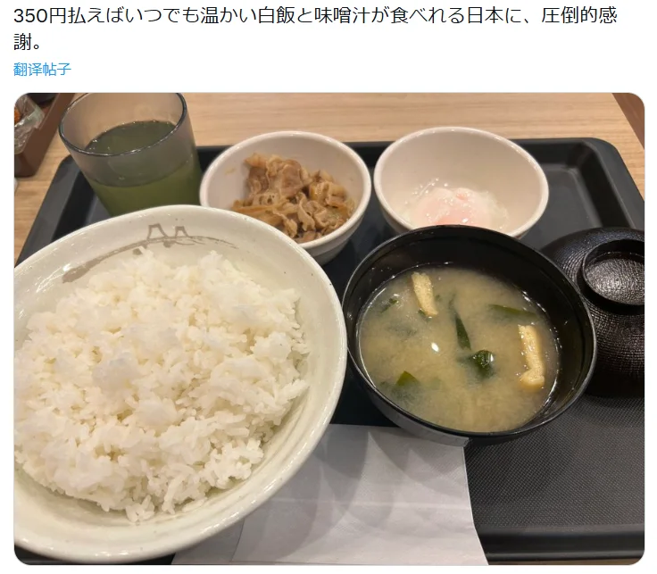 真的真的。花350日元就能吃上热乎白米饭和味噌汤的国家,也太让人感恩了。