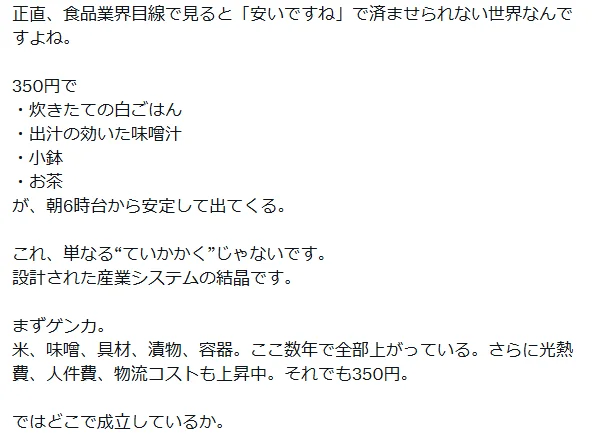 首先看成本:大米、味噌、配菜、腌菜、餐具包装,这几年全在涨。再加上水电煤气、人工费、物流成本都在飙升。就这样,还能守住350日元。