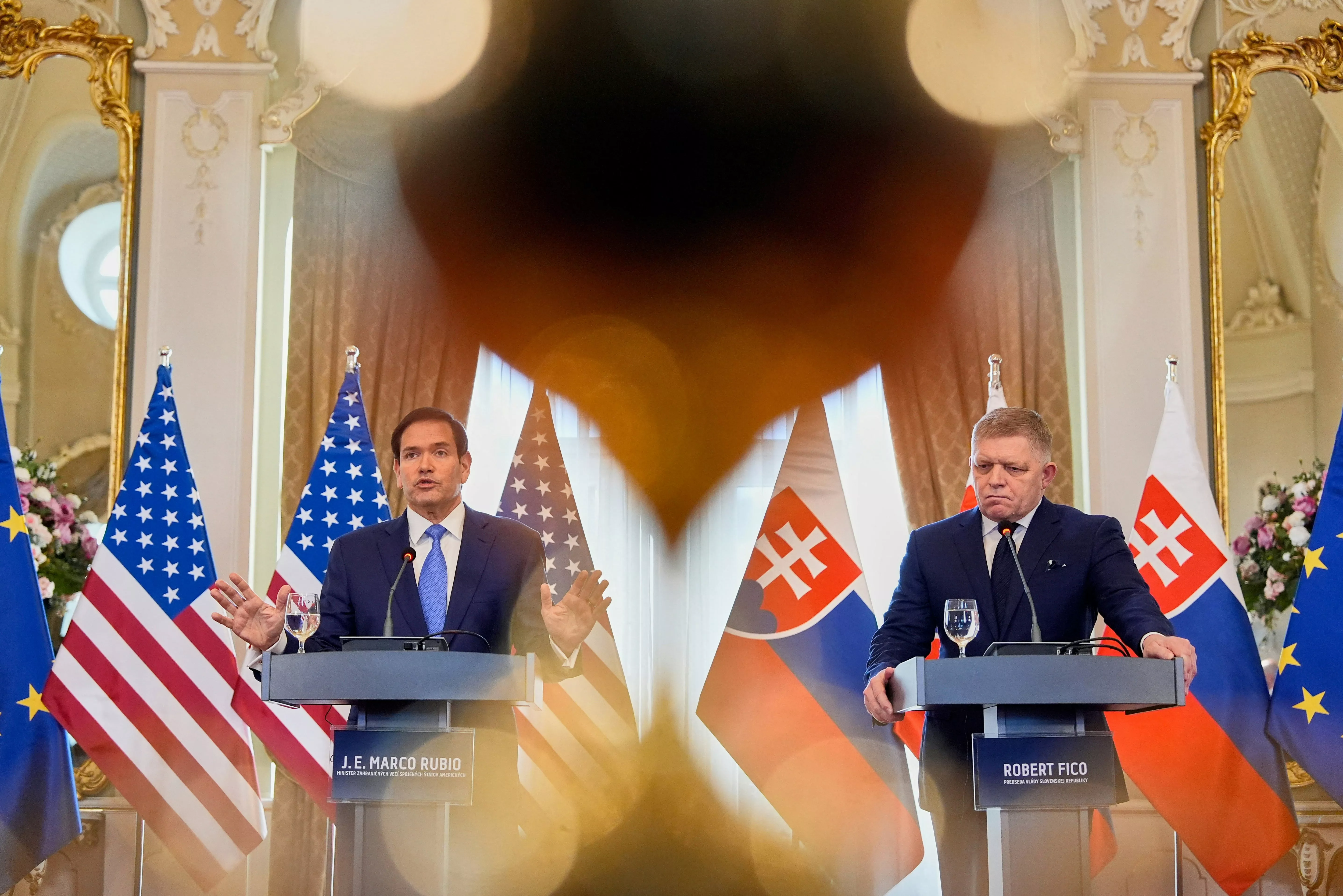 图为2026年2月15日,美国国务卿鲁比奥(Marco Rubio)到访斯洛伐克,与斯洛伐克总理菲佐(RobertFico)会面后共同举行记者会。(Reuters)