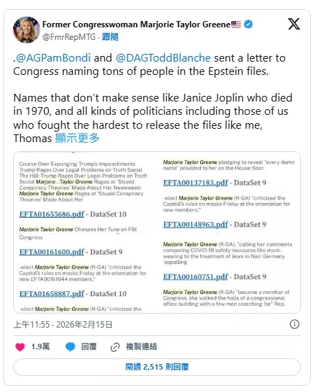 美国佐治亚州共和党众议员、被称为MAGA“女王”的格林(Marjorie Taylor Greene)2026年2月15日在社交平台X上发文,点名批评司法部长邦迪(Pam Bondi)和副部长布兰奇(Todd Blanche),称文件中出现“许多毫无意义的名字”,例如1970年去世的Janis Joplin。(网页截图)