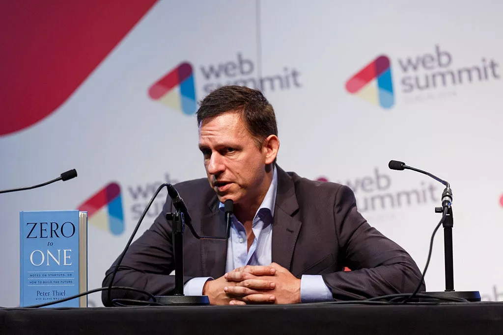 AI软件公司Palantir共同创办人Peter Thiel于2014年11月6日在爱尔兰都柏林举行的记者会发表讲话。(Getty)