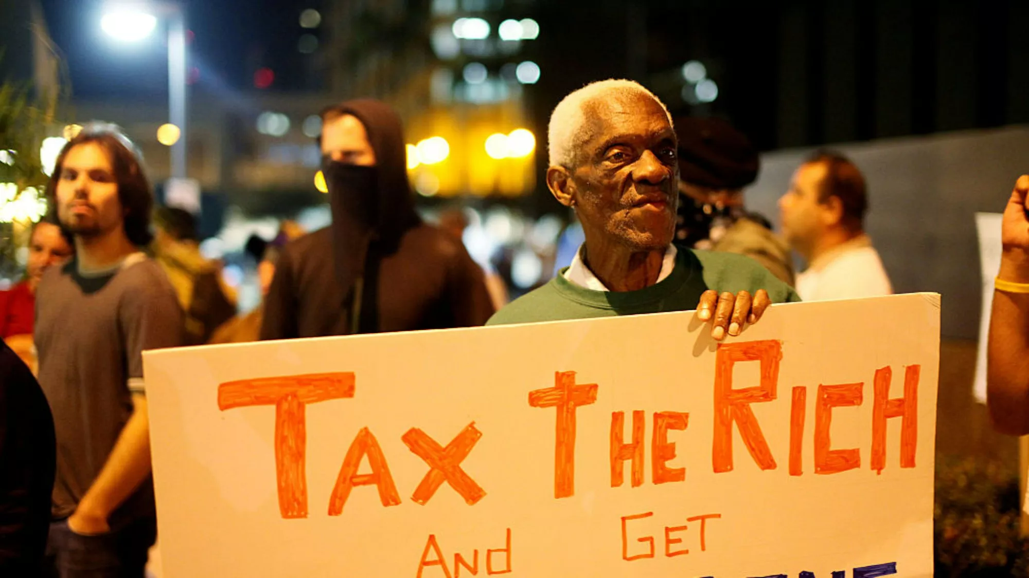 2011年10月13日,美国加州,示威者在集会上,举起写着“对富人征税”(Tax the Rich)的牌。(Getty)