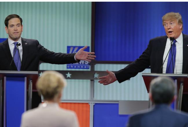 2016年3月3日,共和党总统候选人佛罗里达州联邦参议员鲁比奥(Marco Rubio)与川普(Donald Trump)在密歇根州底特律参加由福克斯新闻主办的辩论。(Getty)