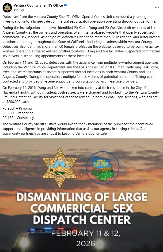 本周二至周三(2026年2月11日至12日),执法人员在文图拉县和洛杉矶县的多处疑似妓院执行了搜查令。此次行动获得了多家机构的协助,包括文图拉警察局和洛杉矶地区人口贩运特别工作组。行动中,董克斌和聂伟于2月12日在哈仙达岗(Hacienda Heights)的家中被捕,整个过程未发生抵抗。