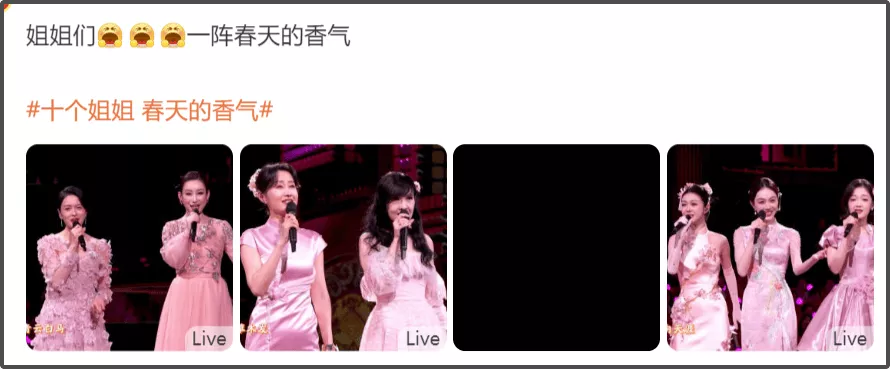 开场热舞之后,周慧敏、刘敏涛、梁咏琪、秦海璐、薛凯琪、张钧甯、姜妍、热依扎、刘惜君、希林娜依高,穿着粉色系衣服齐亮相,演唱歌曲《立春》。这几位美女往台上一站,扑面而来一股桃花香气,春天真的要来了!