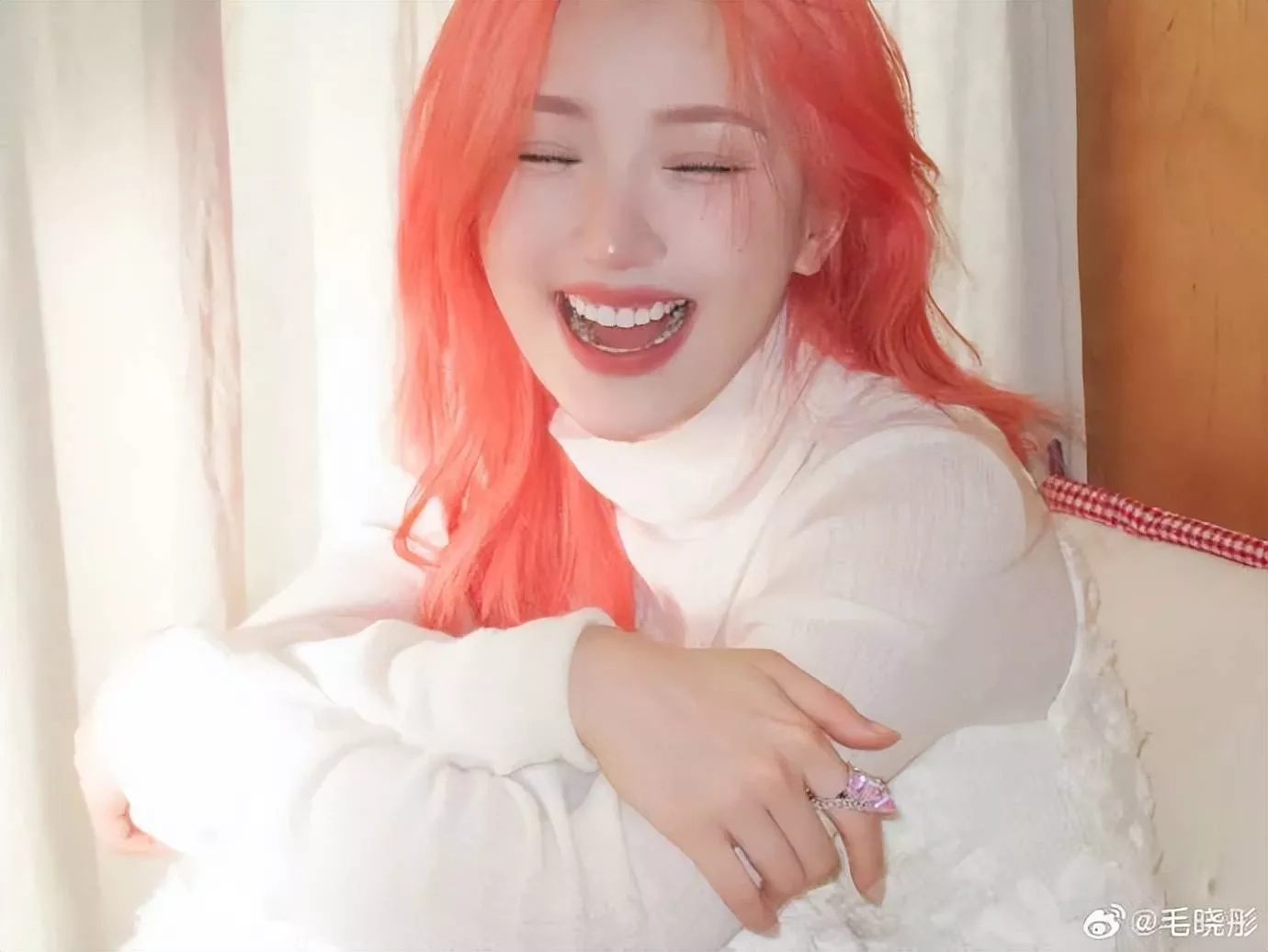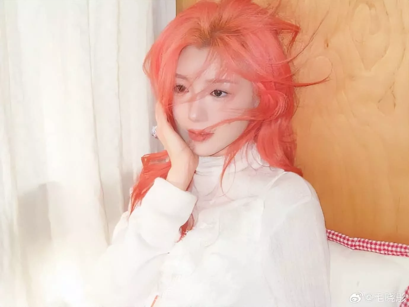 毛晓彤背靠垫子和柜子,她俏脸清丽脱俗,染红的长发飘逸,唇红齿白很撩人,这位女星闭目养神的样子很可爱!