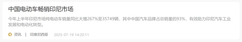 印尼呢更惨,原本90%以上统治级地位,硬生生被撕开一道口子,滑落到81%。而在纯电动车市场中,中国品牌已占据绝对主导地位,市场份额高达93%,2025年上半年纯电动车销量达35749辆,同比增长267%。