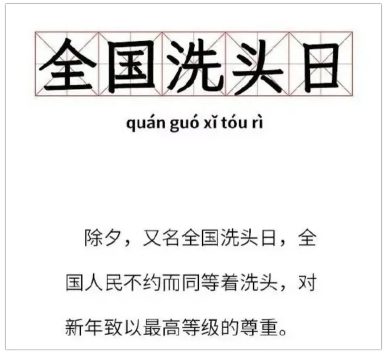 在中国传统习俗中,水常代表财气,人们认为大年初一洗头会洗走财运,所谓“ 除夕洗头辞旧迎新,初一不洗守财运”,因此除夕被戏称为“全国洗头日”。