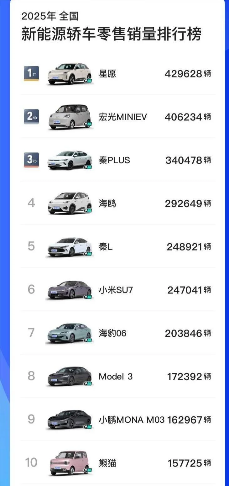 2025年的报废国补催生了几个超级爆款车型:吉利星愿,五菱宏光miniEV和比亚迪秦PLUS和海鸥。