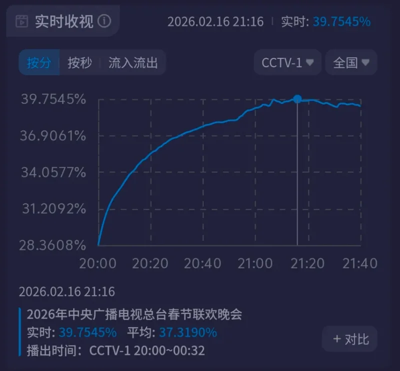 21:16,除夕晚上九点十六分,来个谐音“就要6”,马年春晚收视到达最高点,峰值为39.7545%,再次突破39%,又一次创下新高。