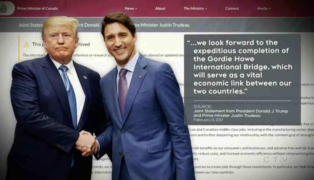 2017年2月,川普与当时的加拿大总理贾斯廷・特鲁多联合发表声明,其中提到:“我们期待戈迪・豪国际桥的迅速完成,这将成为两国之间重要的经济纽带。”