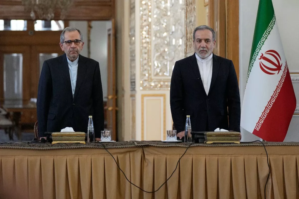 伊朗副外长拉凡奇(左)15日表示,伊朗正寻求与美国达成一项核协议。图为2025年10月5日,伊朗外交部长阿拉奇和拉凡奇在德黑兰与外国使臣会谈前聆听伊朗国歌。(资料照片/美联社)
