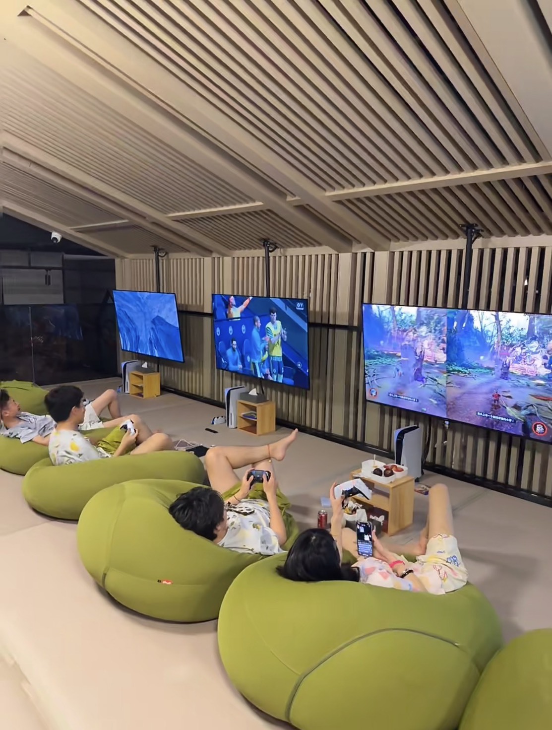 不远处的V汤泉生活馆,则是年轻人的心头好。 这座六层高的场馆,负一层为传统洗浴区,其余楼层则被打造成多元化休闲空间。 白天的V汤泉生活馆多以家庭客群为主,家长们带着孩子在水果区挑选美食、在休闲区看书聊天; 到了傍晚,大学生和年轻上班族结伴而来,他们直奔娱乐区,或组队打游戏、或围坐饮茶小酌,尽兴后再去泡汤放松,最后钻进格子屋或睡眠舱休息。
