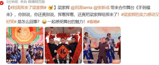 正式春晚的舞台和她本人的咖位还挺适配的,她同时搭档小辈张新成和大咖梁家辉,肢体动作挺灵动,笑得也卖力,央视亲自为她带话题发帖,排场不小。