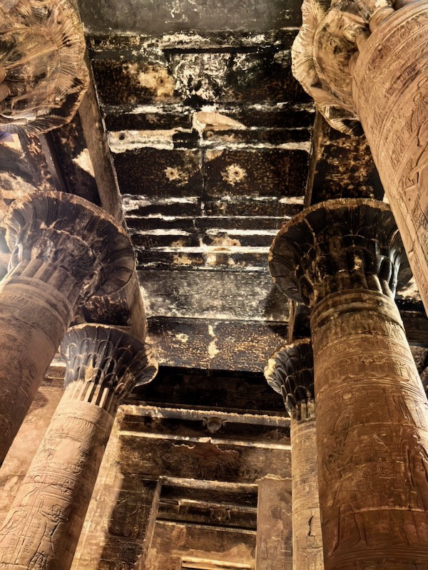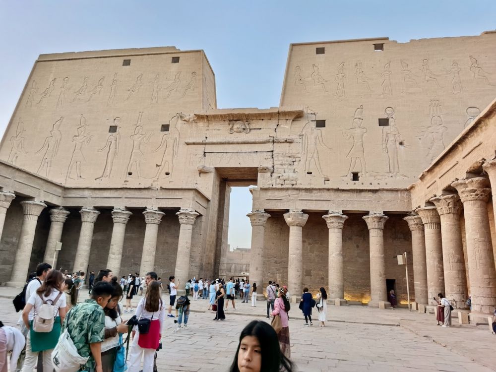 我们一大早起来,顶着还没有退去的星光前往神庙。不像康翁波神庙坐落在尼罗河边,埃德夫神庙位于市中心,从码头到神庙约10分钟的马车路程。据说为了拉动地方经济,政府规定前往神庙必需乘坐马车。我们来到神庙前,只见神庙正面耸立着高达36米的巨大的塔门(Pylon Gate),上面描绘托勒密十二世征服敌人,以及祭祀神灵的场景,细节丰富、气势磅礴,是整个神庙的精神象征。门前矗立两尊黑色玄武岩雕刻而成的鹰神荷努斯雕像(Statue of Horus),它目光坚定,象征守护和力量。穿过塔门便进入一个宽敞的庭院,庭院三面以柱廊环围,花卉柱头的石柱林立,这里是公共祭祀区。穿过庭院是两间多柱厅(Hypostyle Hall),第一座大厅墙壁上的浮雕描绘神庙奠基场景,以及法老进行祭祀的画面,第二座则展现荷努斯乘坐圣舟,由女神哈索尔陪伴的旅程。从第二座多柱厅进入横厅,再往前便是圣殿(Sanctuary)。圣堂是神庙的核心,保存有荷努斯祭坛。周围是其他神祇的小神庙,供奉哈索尔(Hathor,荷努斯之妻)、太阳神-拉(Ra)、和冥王奥西里斯(Osris,荷努斯之父)等等众神。