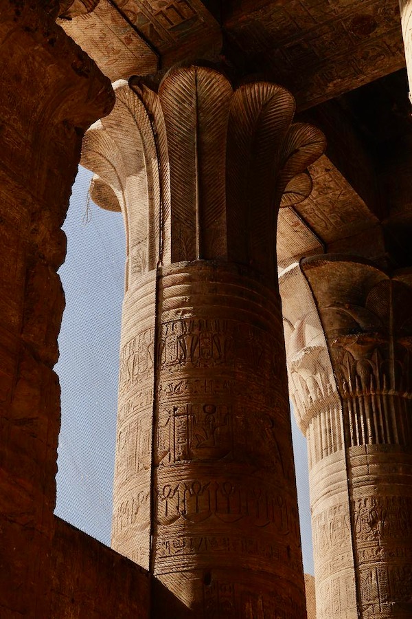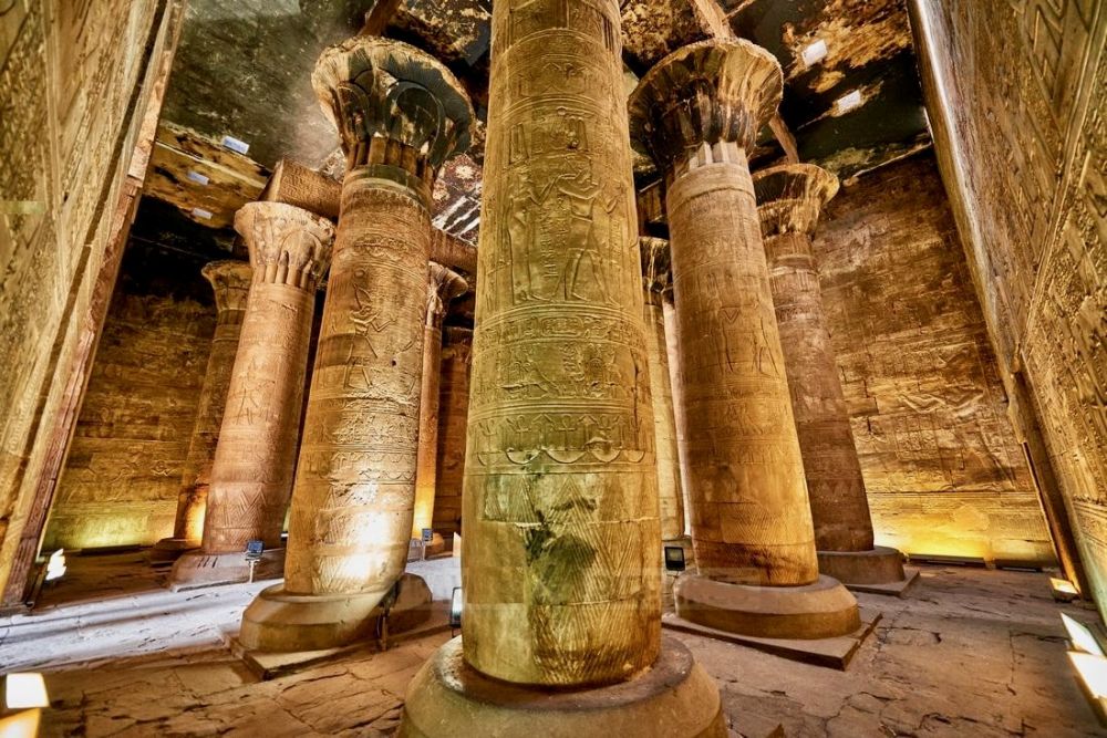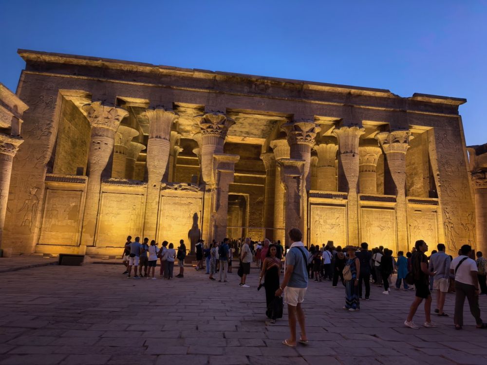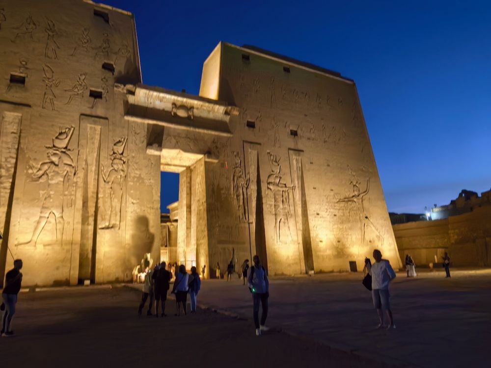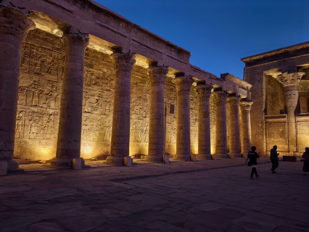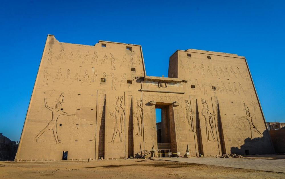 埃德夫神庙(Temple of Edfu)又称荷努斯神庙(Temple of Horus),位于尼罗河西岸埃德夫城,供奉鹰头神荷努斯(Horus)。神庙建于公元前237年托勒密三世(Ptolemy III)时期,历时180年于托勒密十二世((Ptolemy XII)时期的公元前57年竣工。埃德夫神庙是仅次于卡纳克神庙埃及第二大神庙,整个神庙献给荷努斯,它是天空之神,王权的守护者,象征太阳与正义。荷努斯的形象通常为鹰头人身,头戴埃及王冠,腰围亚麻短裙,手持能量手杖沃斯(Was)和生命符号安卡(Ankh)。这座保存最完好、雕刻最精致的神庙,见证了古埃及人对荷努斯神的崇敬与信仰。罗马人推行基督教一神宗教后,埃德夫神庙被废弃,逐渐被沙土掩埋,人们甚至在上面建起房屋。直到法国远征队于1798年到来,发现神庙塔门的顶部。1860年法国的埃及学家奥古斯特·马里埃特(Auguste Mariette)开始发掘工作,发掘清理工作持续了20多年,神庙才得以重见天日。由于长期埋在沙土下面,使得神庙好好保存下来。它完整的壁画和众多的象形文字对埃及考古学极为重要。如今它是埃及的重要旅游景点,是尼罗河游轮必停之地。