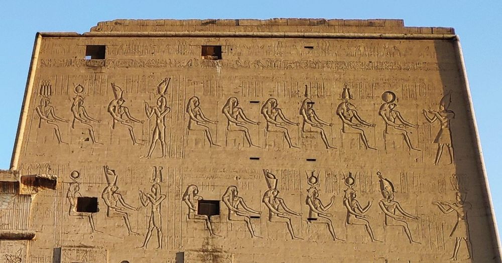 塔门上部是托勒密十二世向荷努斯以及众神敬献的浮雕。