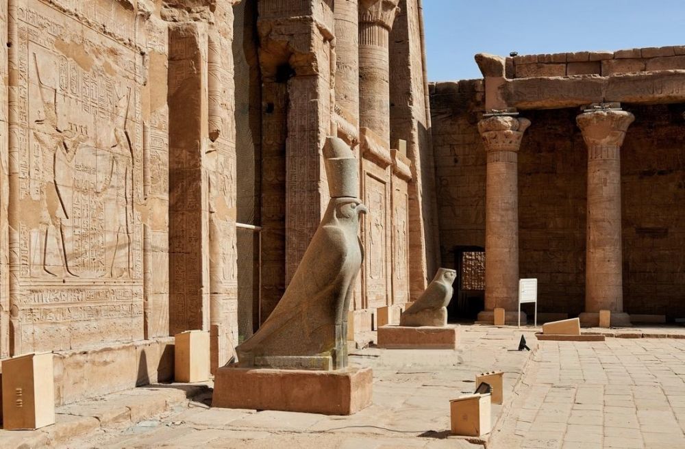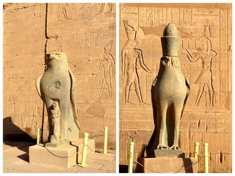 进入内廷门前又有一对荷努斯鹰型黑色花岗岩雕像,左边雕像高大威武,头戴王冠,有坚定的眼神和巨型的喙。右边是一座矮小呆萌的小鹰,象征幼年时的荷努斯。