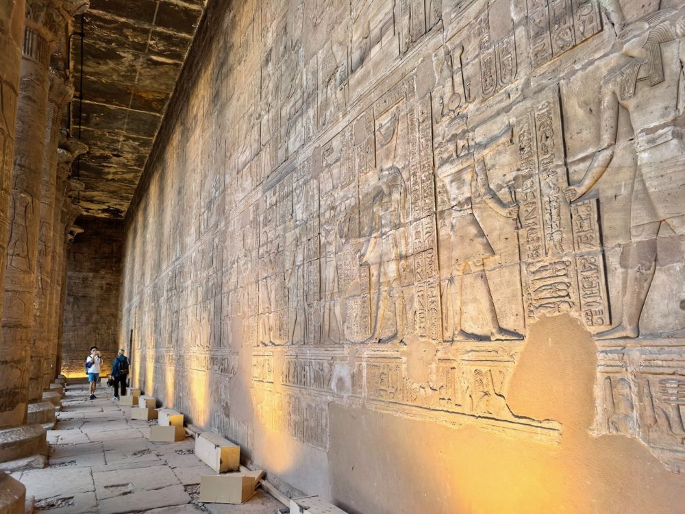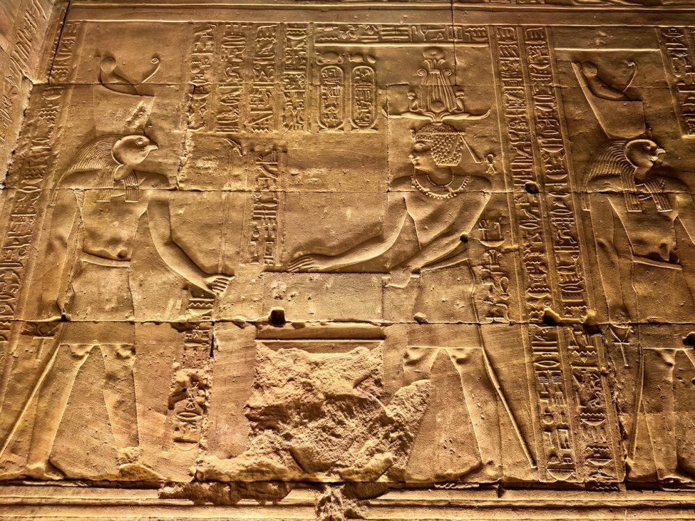 墙壁上的浮雕保存完好,法老向荷努斯敬献的场景